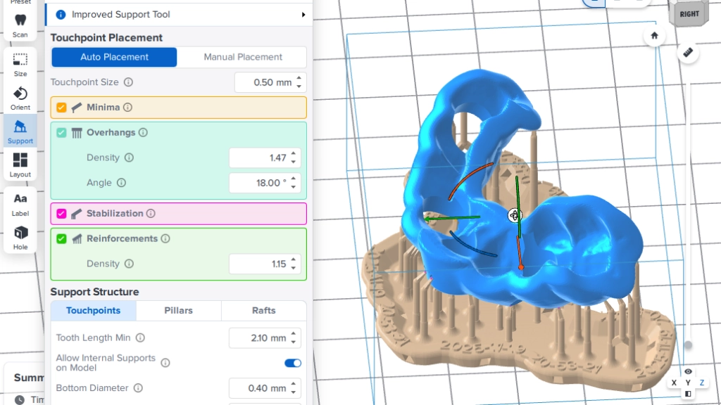 Daarna wordt een zogenaamde guide ontworpen. Dit is een malletje die tijdens het implanteren exact passend over het gebit geschoven wordt, net als een beugel. In dat malletje is de exacte richting en diepte bepaald. Wij beschikken over een professionele, nauwkeurige 3D printer: het ontwerp wordt werkelijkheid.