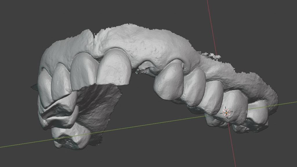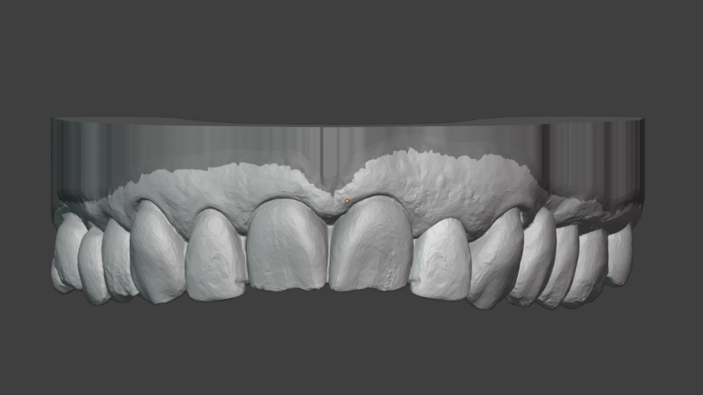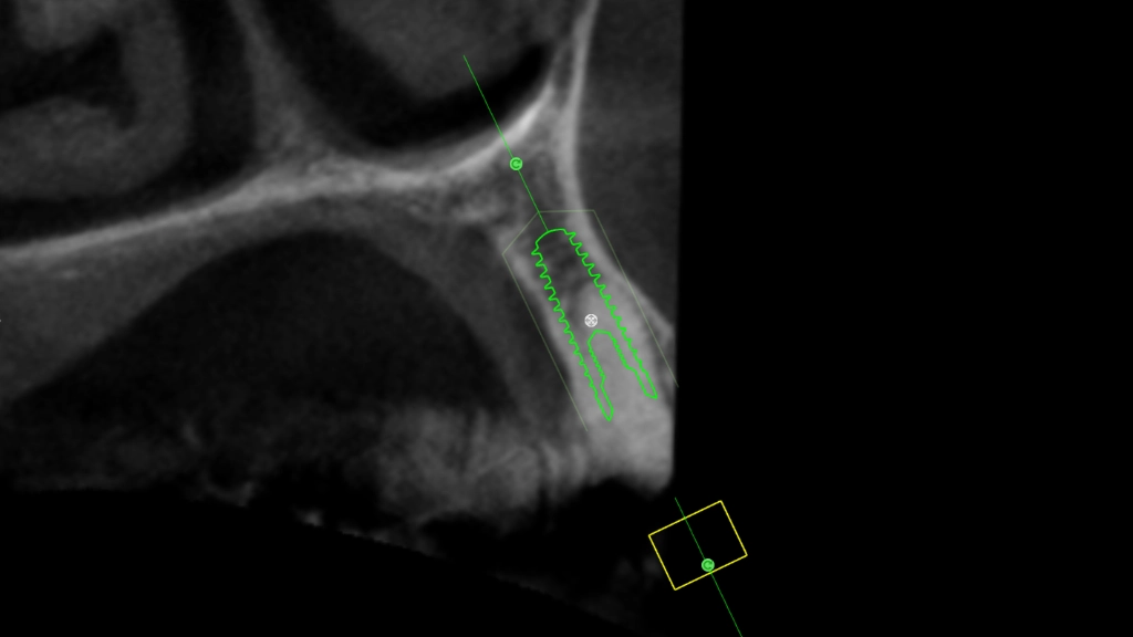We maken een CT scan van je gebit, een gebitsscan met een soort cameraatje en dan gaat Hurx aan de slag: buiten de mond. In een simulatieprogramma maken we een waxup model, een fictieve planning implantaat en als alles meezit een guide. Een waxup model is een inschatting hoe de nieuwe tand eruit moet komen te zien, we kunnen de implantaatpositie daarop aanpassen.