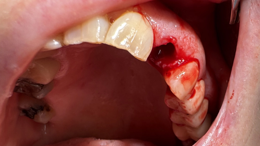 De tandarts verdooft je tandvlees en haalt heel voorzichtig de oude wortel weg. Normaal gesproken zonder boren of snijden. De wond wordt goed schoongemaakt. Het wondje oogt een beetje als een neusgat met een neusbloeding. Al heel snel klontert het weer samen.