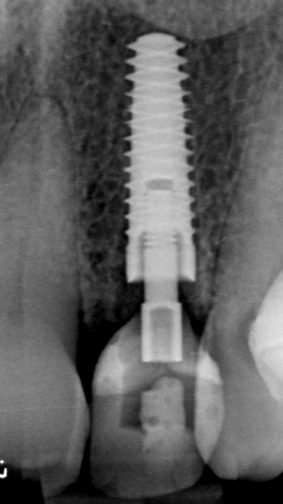 De röntgenfoto laat een mooie positie zien. (Op de foto lijkt deze niet precies in het midden te staan, maar dit is absoluut vertekening door de inzetrichting van de röntgenbuis). Aan weerszijden van het implantaat is de tandkas van de oude wortel goed zichtbaar. De tijdelijke stift is niet zichtbaar op röntgenfoto's.